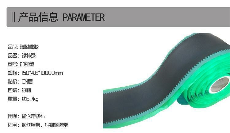 RT-EP400。粘接工藝,配合瑞塔供應(yīng)的冷硫化膠水T粘接良好,對于大面積穿透和非穿透撕裂都有著較好的粘接修補(bǔ)。?修補(bǔ)條產(chǎn)品詳情:產(chǎn)品介紹:橡膠修補(bǔ)條寬度有:1、加強(qiáng)型修補(bǔ)條(帶織物層):100mm、150mm、220mm、300mm、40